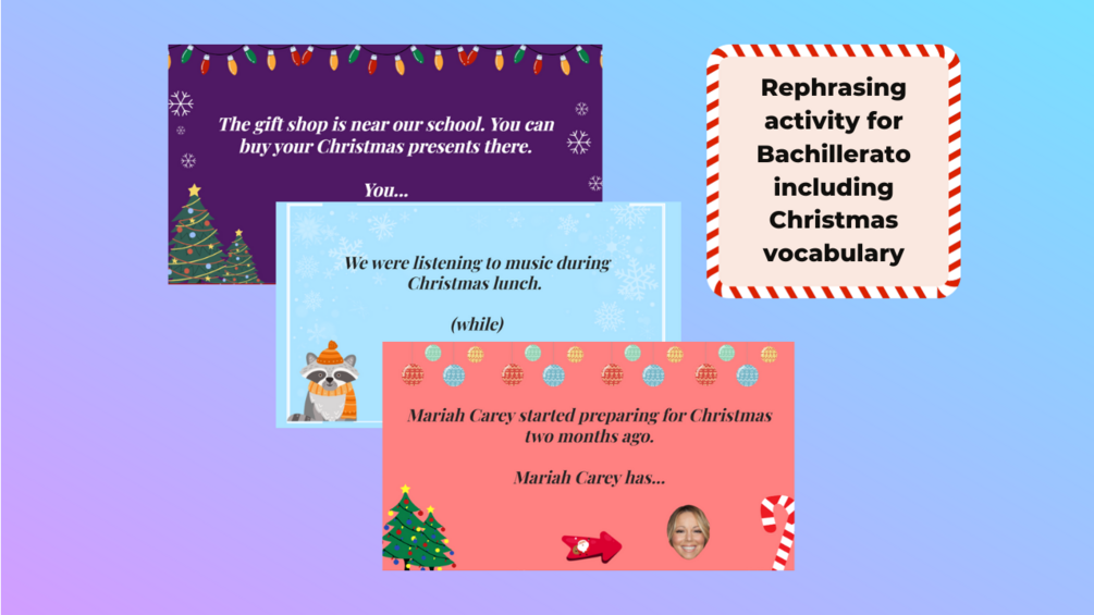 Presentación de Genially con ejercicios de rephrasing con temática navideña para repasar parte de la gramática de Bachillerato.