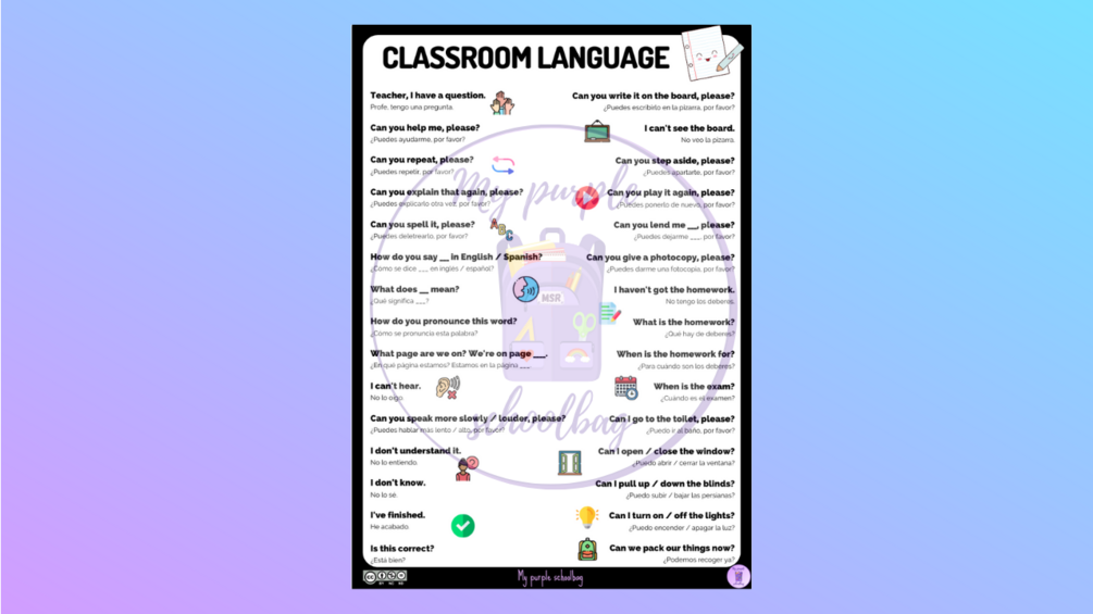 🇬🇧 List of the most frequently used classroom language, both in English and Spanish.