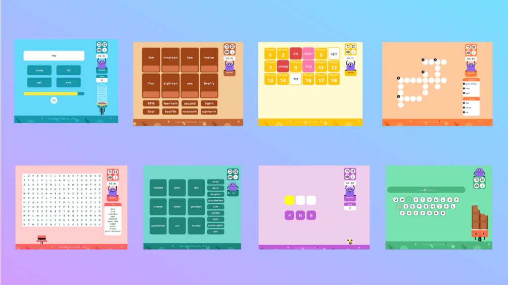 🇬🇧 More than 40 Educandy games to revise basic vocabulary in English: wordsearches, crosswords, anagrams, multiple choice, noughts and crosses, hangman, match-up, and memory games.