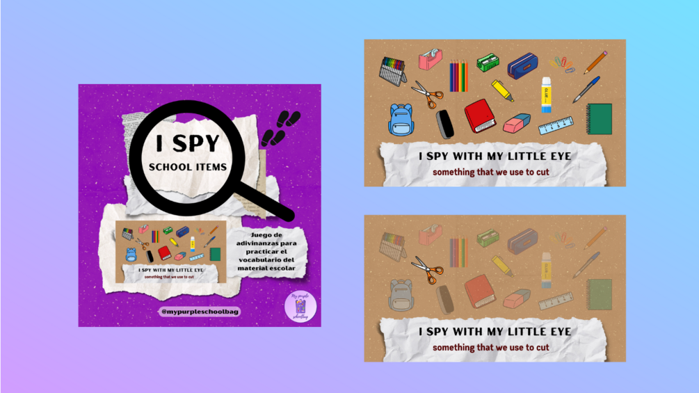 🇬🇧 Canva presentation including 17 riddles to play "I spy with my little eye" and practise school items vocabulary.